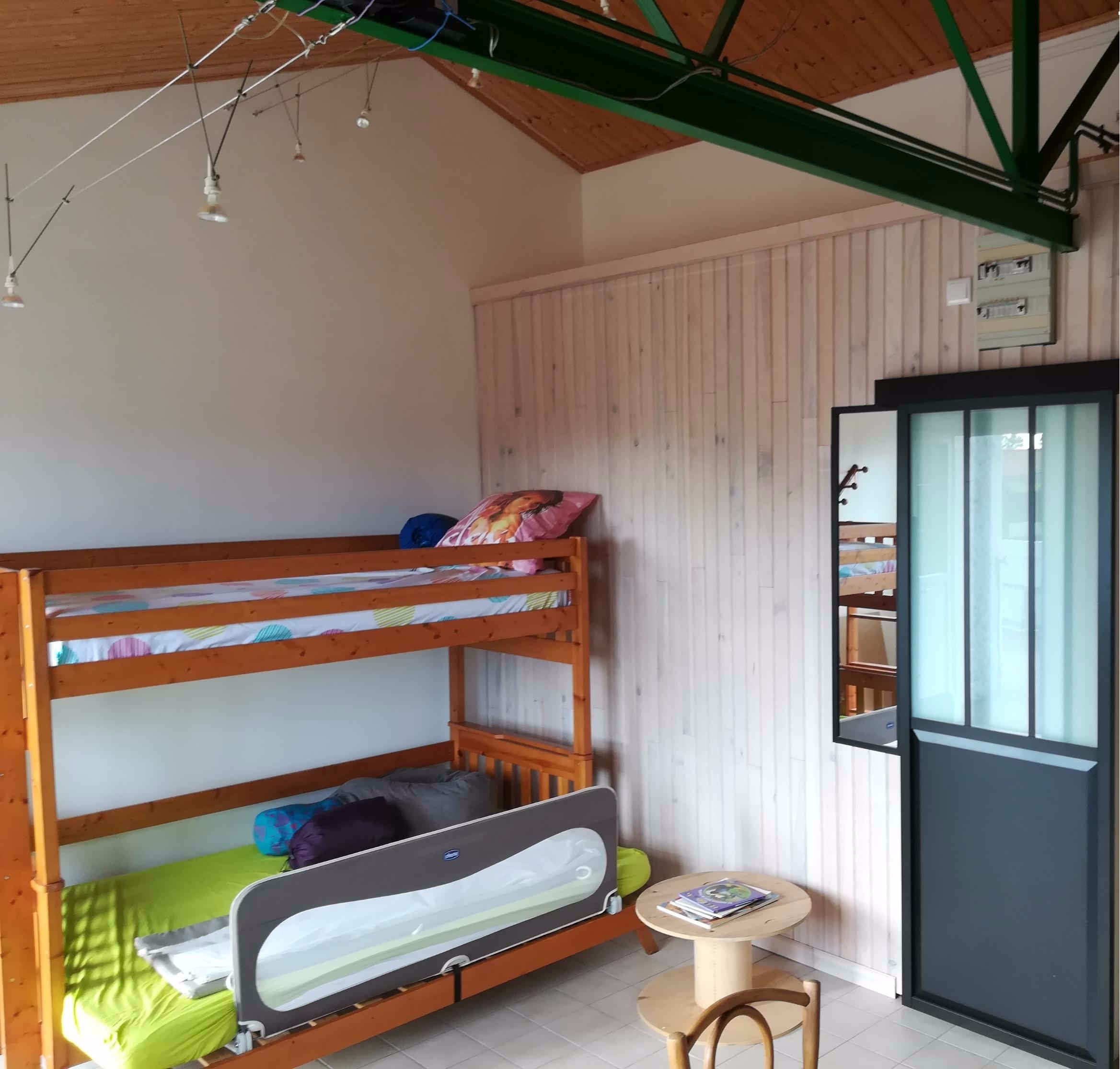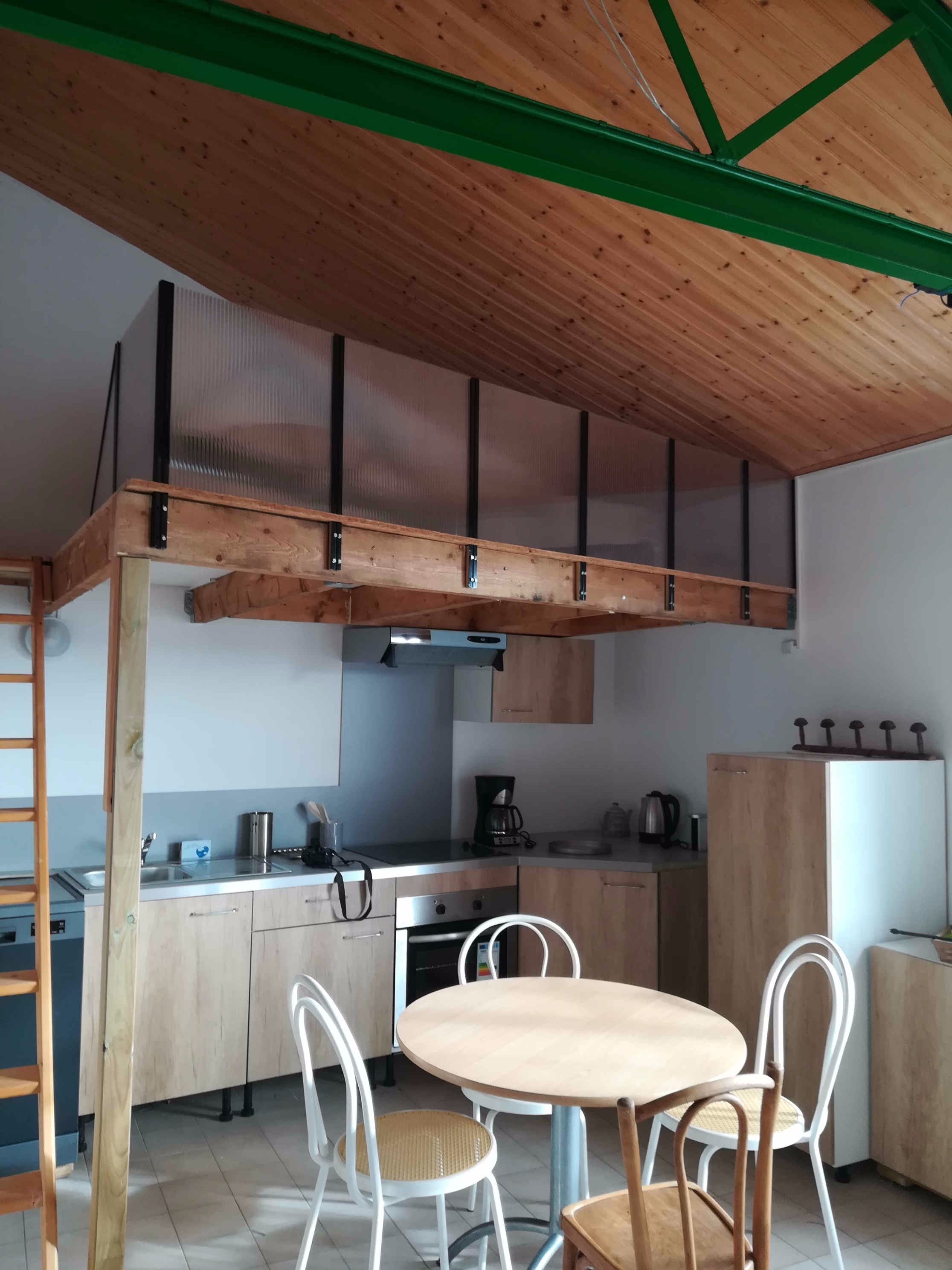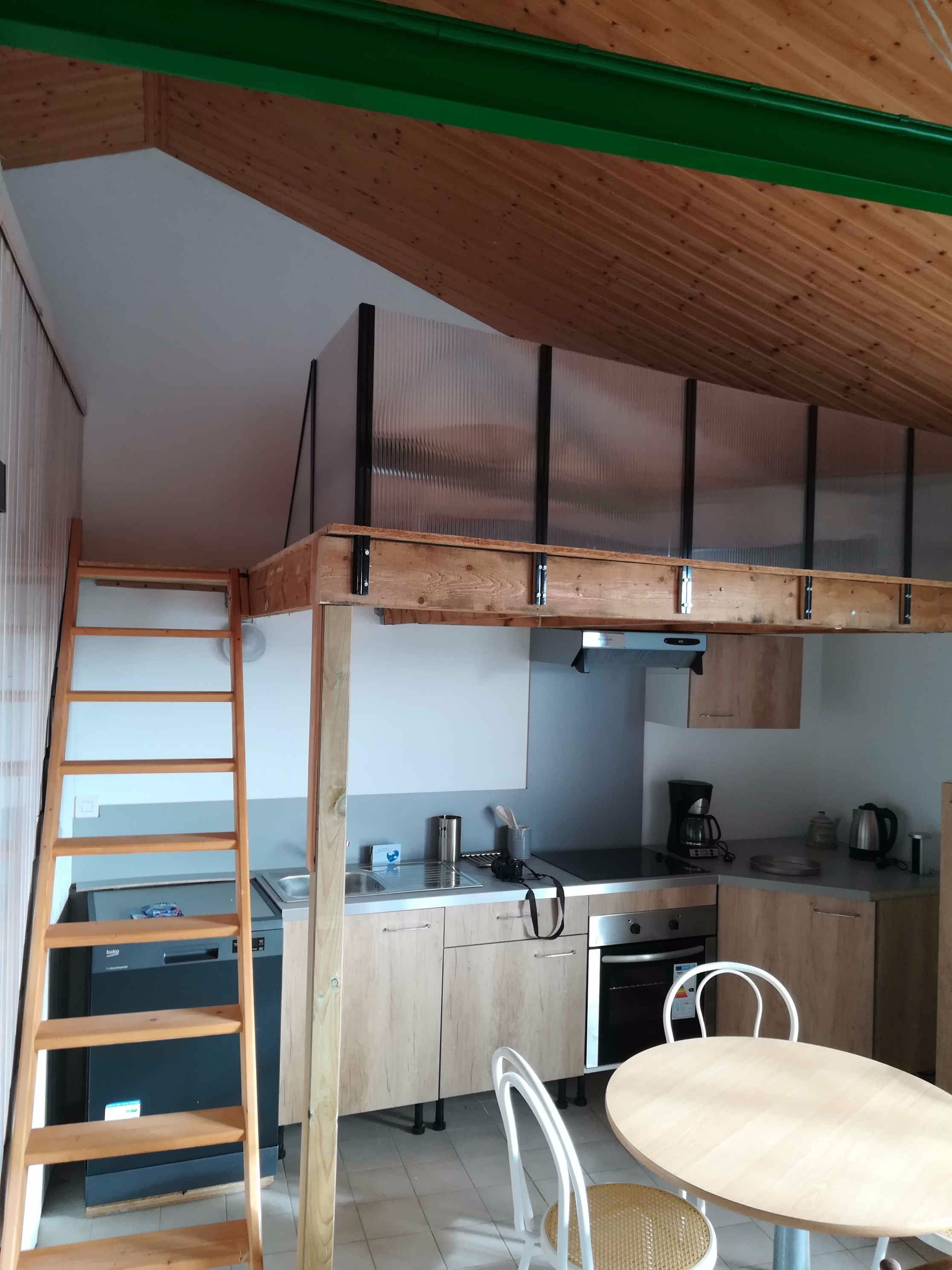 Une Chambre indépendante 2 personnes, salle de bain (douche WC ) , une vaste pièce qui abrite la cuisine équipée ,un lit une personne en mezzanine et un lit de 2 personnes.